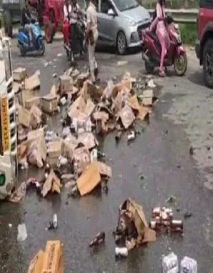 देखते ही देखते दर्जनों लोगों ने शराब की पेटियां उठाकर भागना शुरू कर दिया. कुछ लोग बोतलें अपने थैलों, जेबों और यहां तक कि कपड़ों में छिपाकर ले जाने की कोशिश करने लगे. इस आपाधापी में कई बोतलें टूट गईं जिससे शराब सड़क पर बहने लगी और वहां फिसलन की स्थिति उत्पन्न हो गई.